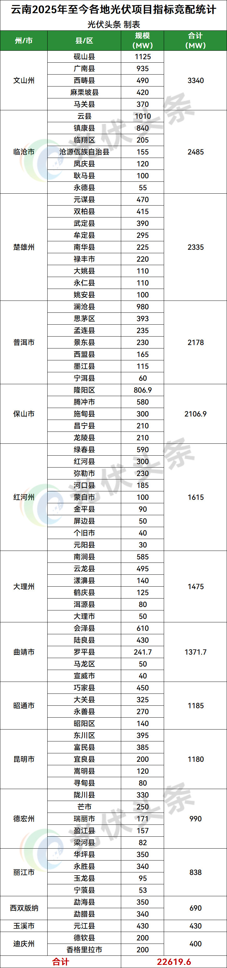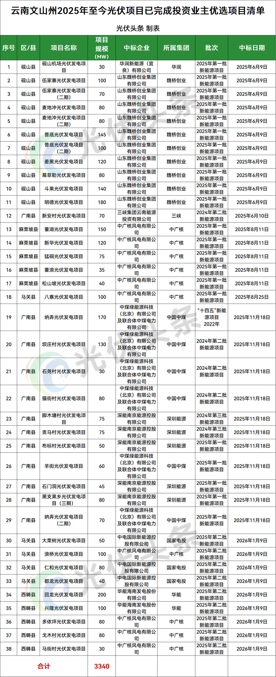 文山州砚山县、广南县、西畴县、麻栗坡县、马关县5地光伏项目竞配结果公示,规模共计3340MW;