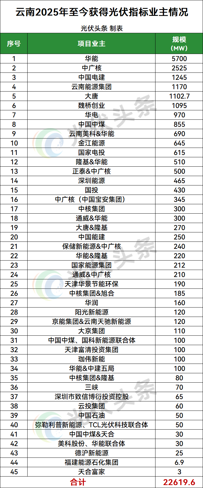 项目业主方面,华能、中广核、中国电建、云南能源集团、大唐、魏桥创业、华电、中国中煤、云南美科&华能、金江能源、国家电投、隆基&华能、正泰&中广核、深圳能源、国投、中广核(中国宝安集团)、中核集团、通威&华能、大唐&隆基、中国能建、保储新能源&中广核、华能&隆基、国家能源集团、通威&中广核、天津华景节能环保、中核集团&旭合、华润、阳光新能源等45家企业或联合体获得光伏指标。