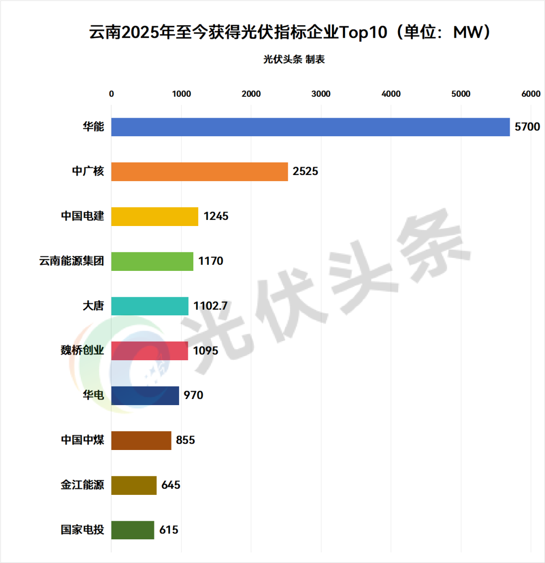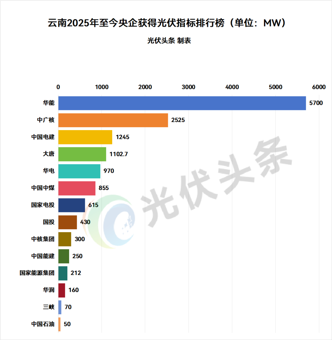 具体到央企方面,2025年至今,华能、中广核、中国电建、大唐、华电、中国中煤、国家电投、国投、中核集团、中国能建、国家能源集团、华润、三峡、中国石油等14家央企获得云南光伏指标,规模合计14484.7MW,占比64.04%。(注:不包含含央企的联合体中标规模)