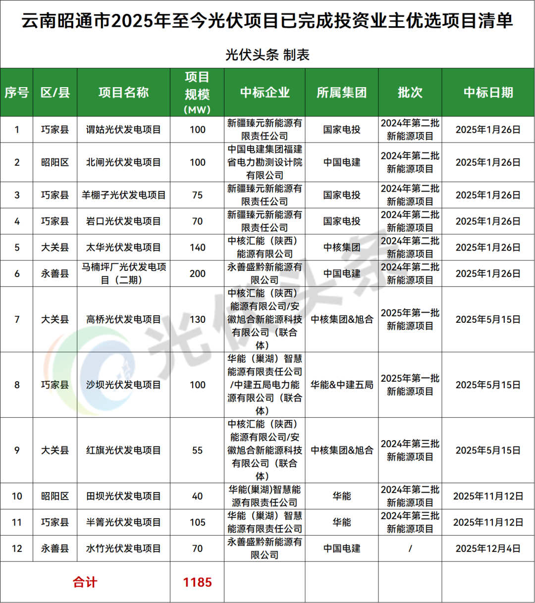 昭通市巧家县、大关县、永善县、昭阳区4地光伏项目竞配结果公示,规模共计1185MW;