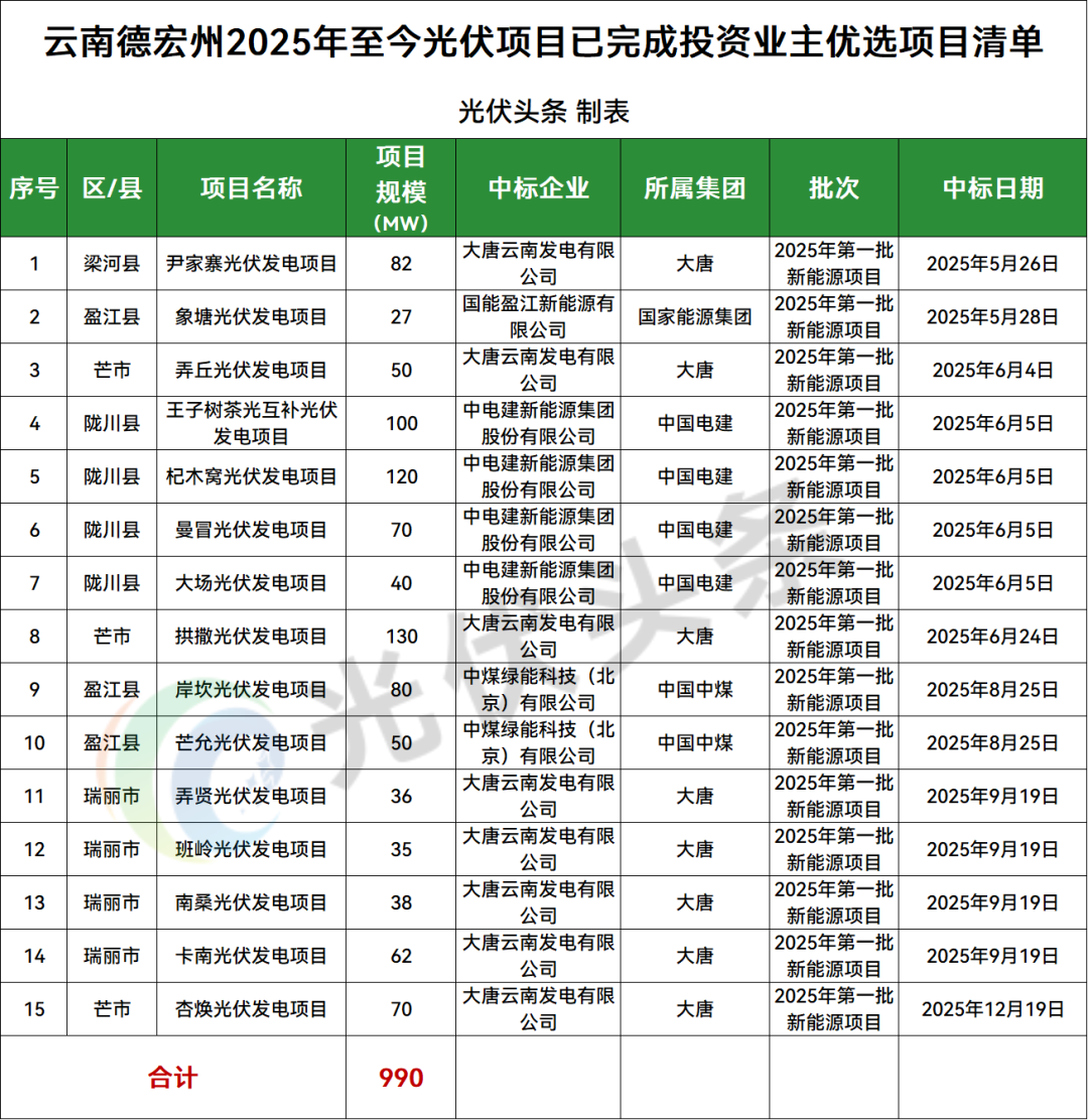 德宏州陇川县、芒市、瑞丽市、盈江县、梁河县5地光伏项目竞配结果公示,规模共计990MW;