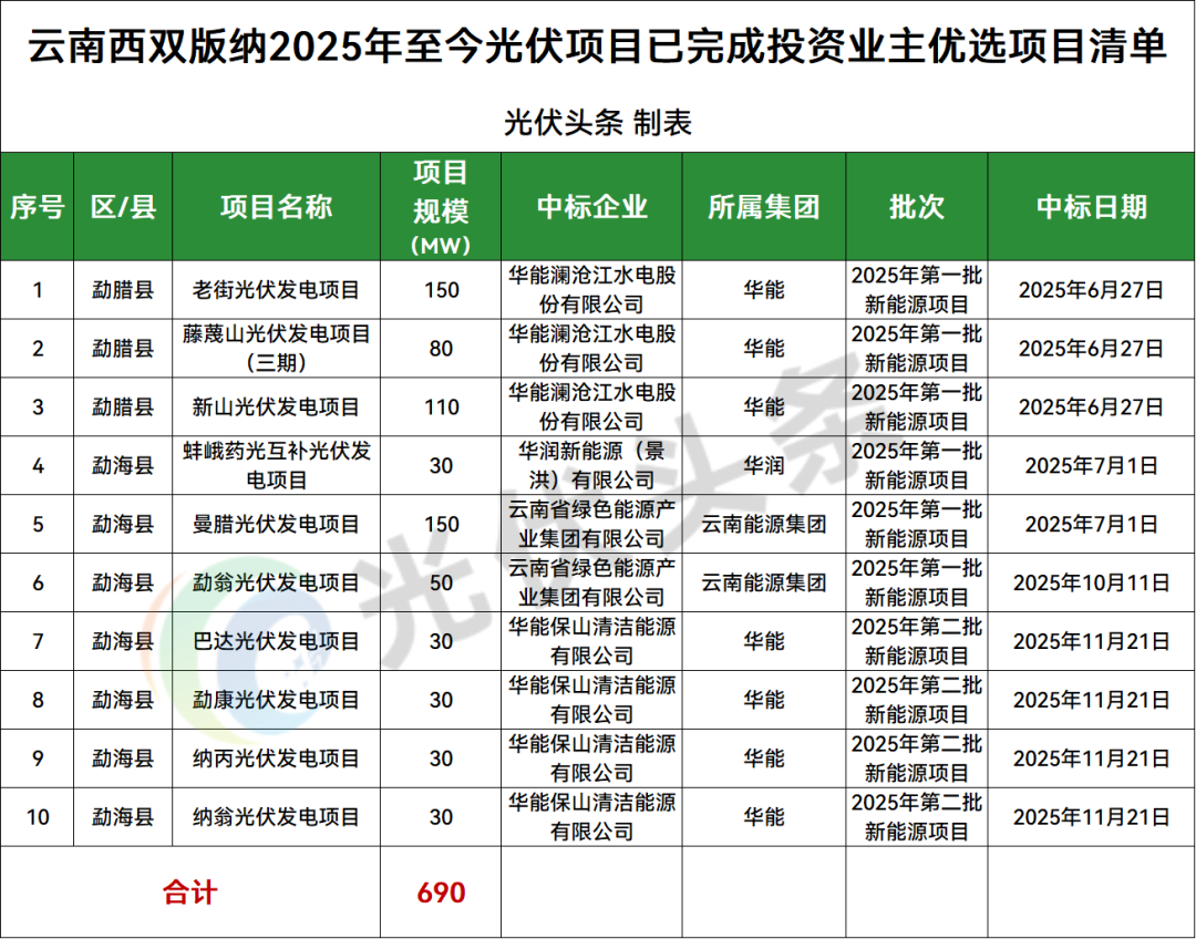 西双版纳勐腊县、勐海县2地光伏项目竞配结果公示,规模共计690MW;