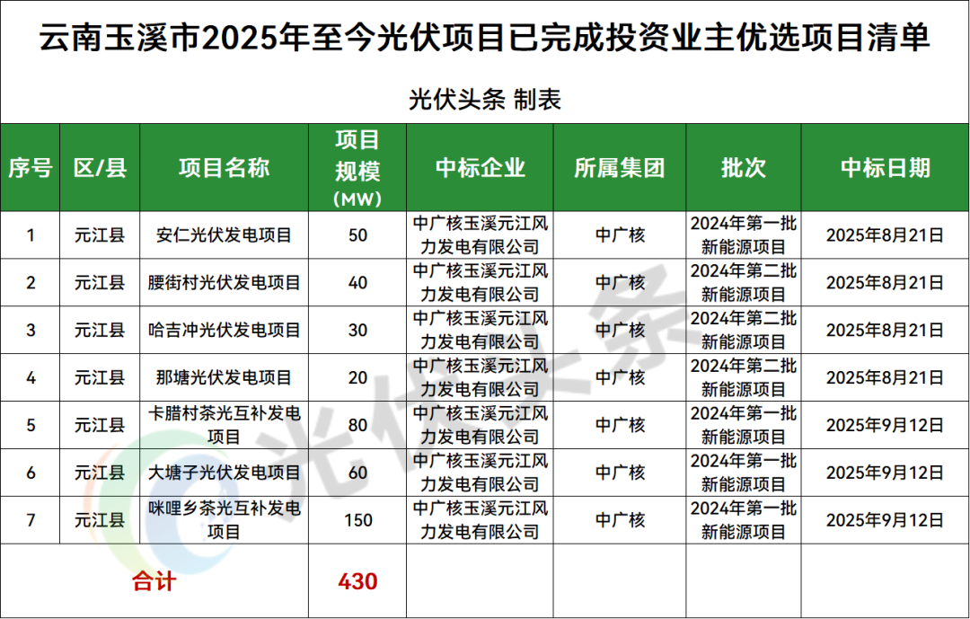 玉溪市元江县1地光伏项目竞配结果公示,规模430MW;