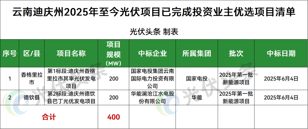 迪庆州香格里拉市、德钦县2地光伏项目竞配结果公示,规模共计400MW。
